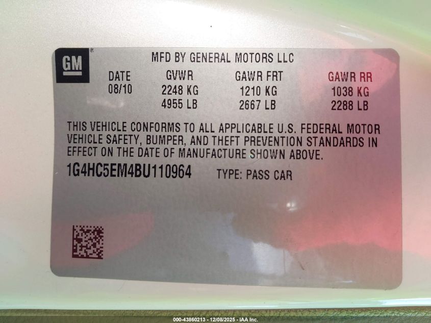 2011 BUICK LUCERNE 2011 року Бензин, 3.9, Передній привід, vin - 1G4HC5EM4BU110964 з США