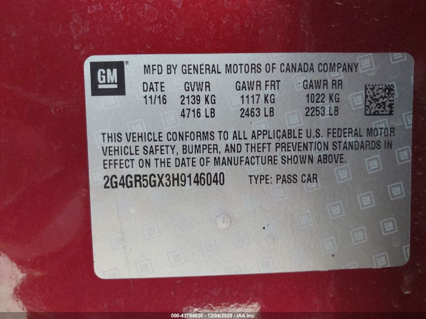 2017 BUICK REGAL 2017 року Бензин, 2.0, Передній привід, vin - 2G4GR5GX3H9146040 з США