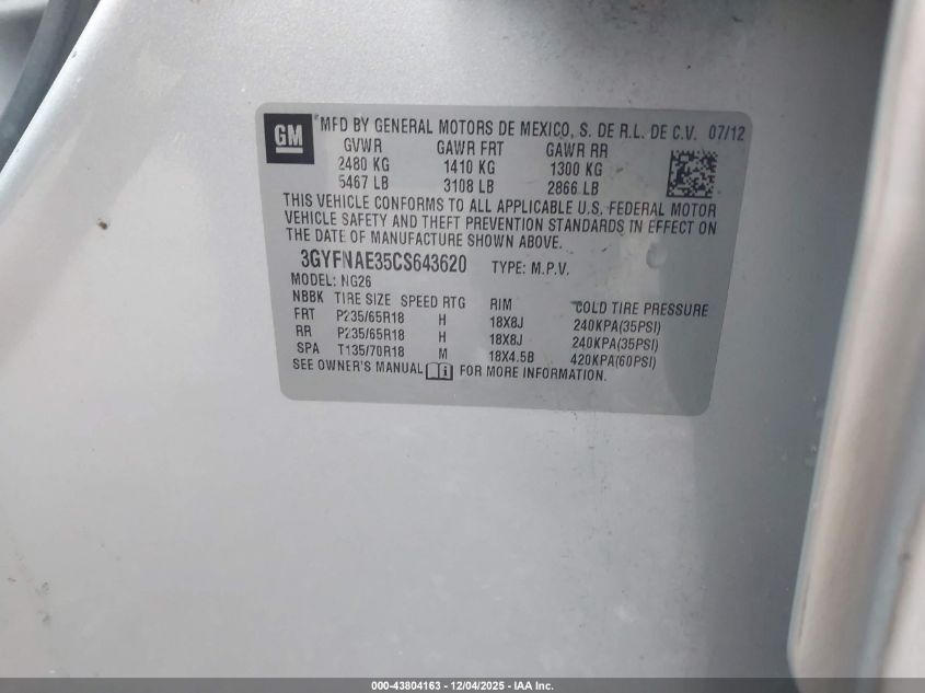 Колір СрібнийЦиліндри 6Привід Передній привідVIN 3GYFNAE35CS643620Стан СтаціонарноУшкодження Звичайний знос