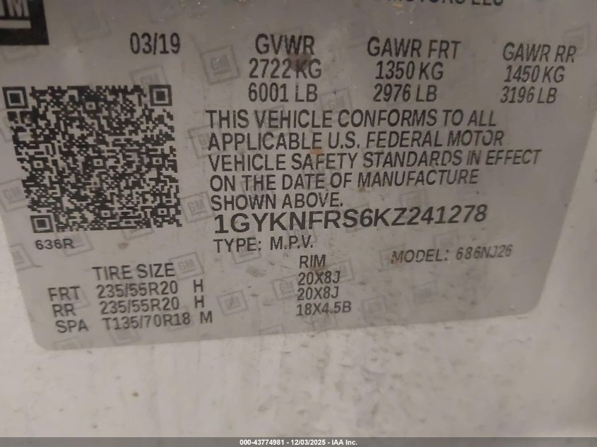 2019 CADILLAC XT5 2019 року Бензин, 3.6, Повний привід, vin - 1GYKNFRS6KZ241278 з США