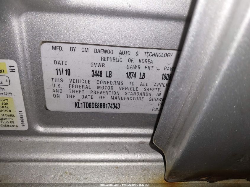 2011 CHEVROLET AVEO 2011 року Бензин, 1.6, Передній привід, vin - KL1TD6DE8BB174343 з США