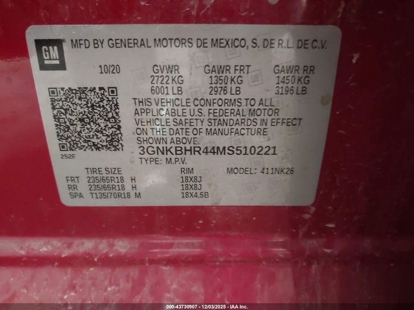 Колір ЧервонийЦиліндри 4Привід Повний привідVIN 3GNKBHR44MS510221Стан СтаціонарноУшкодження Передня або задня AutoRIA