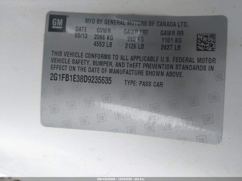 Колір БілийЦиліндри 6Привід Задній привідVIN 2G1FB1E38D9235635Стан Заводиться та їде (перевірено)Ушкодження Передня або задня AutoRIA
