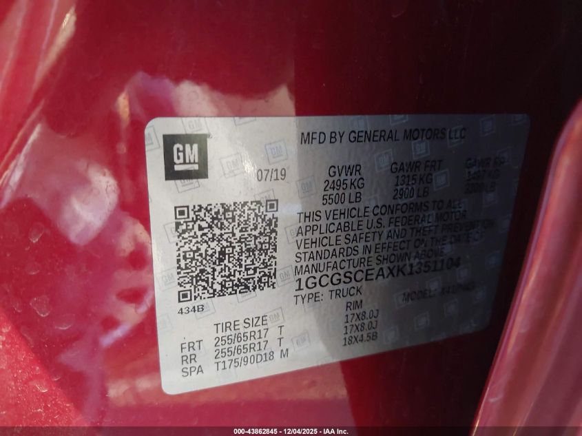 2019 CHEVROLET COLORADO 2019 року Бензин, 2.5, , vin - 1GCGSCEAXK1351104 з США