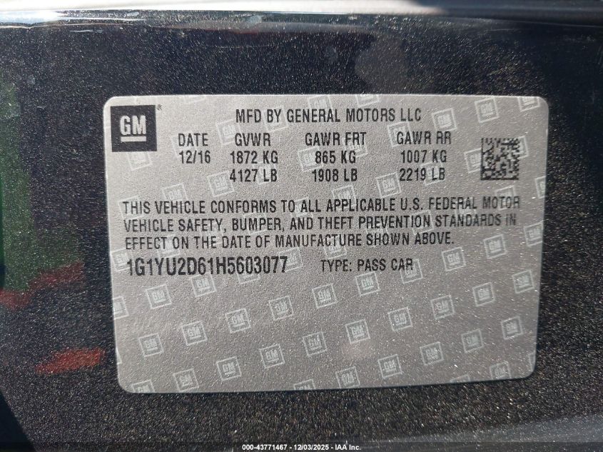 2017 CHEVROLET CORVETTE 2017 року Бензин, 6.2, Задній привід, vin - 1G1YU2D61H5603077 з США