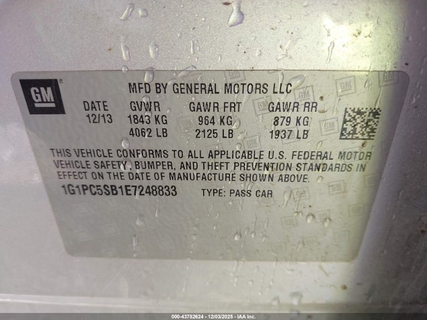 2014 CHEVROLET CRUZE 2014 року Бензин, 1.4, Передній привід, vin - 1G1PC5SB1E7248833 з США