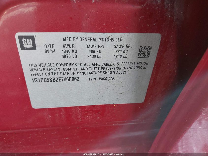2014 CHEVROLET CRUZE 2014 року Бензин, 1.4, Передній привід, vin - 1G1PC5SB2E7468062 з США