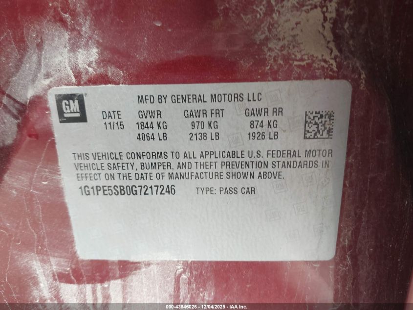 2016 CHEVROLET CRUZE 2016 року Бензин, 1.4, Передній привід, vin - 1G1PE5SB0G7217246 з США