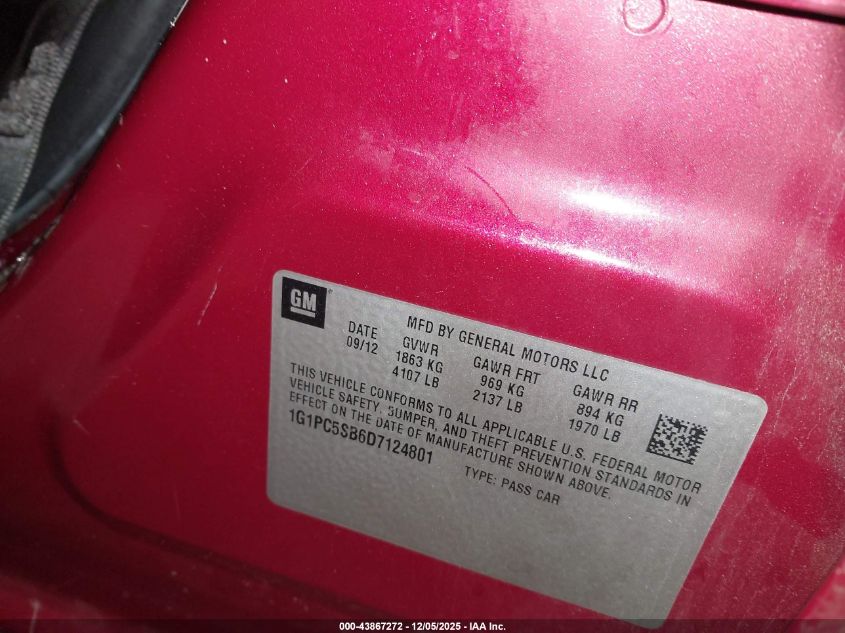 2013 CHEVROLET CRUZE 2013 року Бензин, 1.4, Передній привід, vin - 1G1PC5SB6D7124801 з США