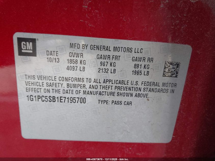 2014 CHEVROLET CRUZE 2014 року Бензин, 1.4, Передній привід, vin - 1G1PC5SB1E7195700 з США