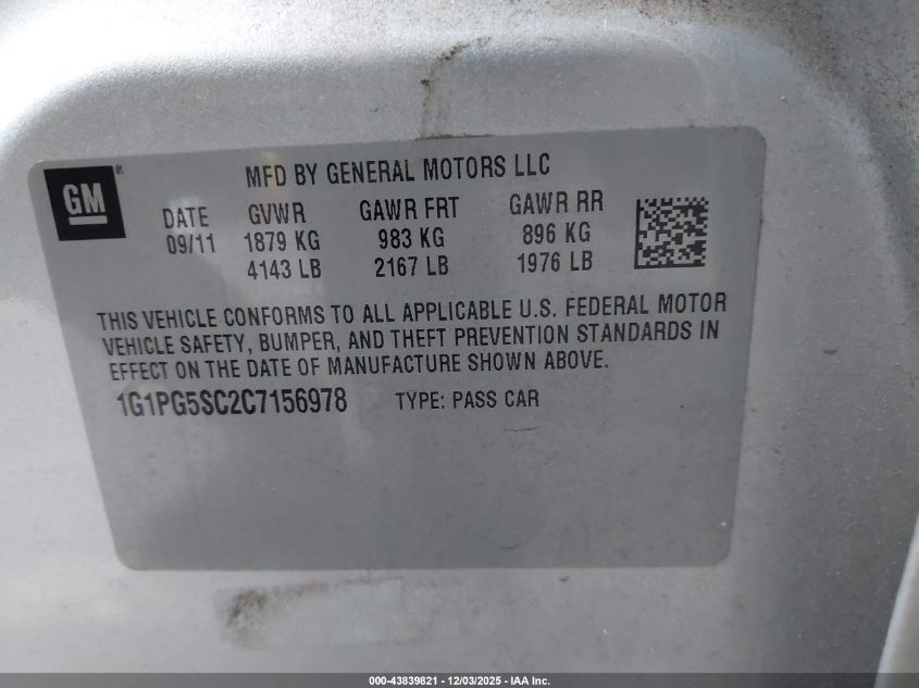 2012 CHEVROLET CRUZE 2012 року Бензин, 1.4, Передній привід, vin - 1G1PG5SC2C7156978 з США