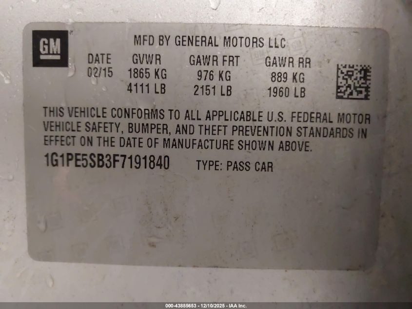 2015 CHEVROLET CRUZE 2015 року Бензин, 1.4, Передній привід, vin - 1G1PE5SB3F7191840 з США