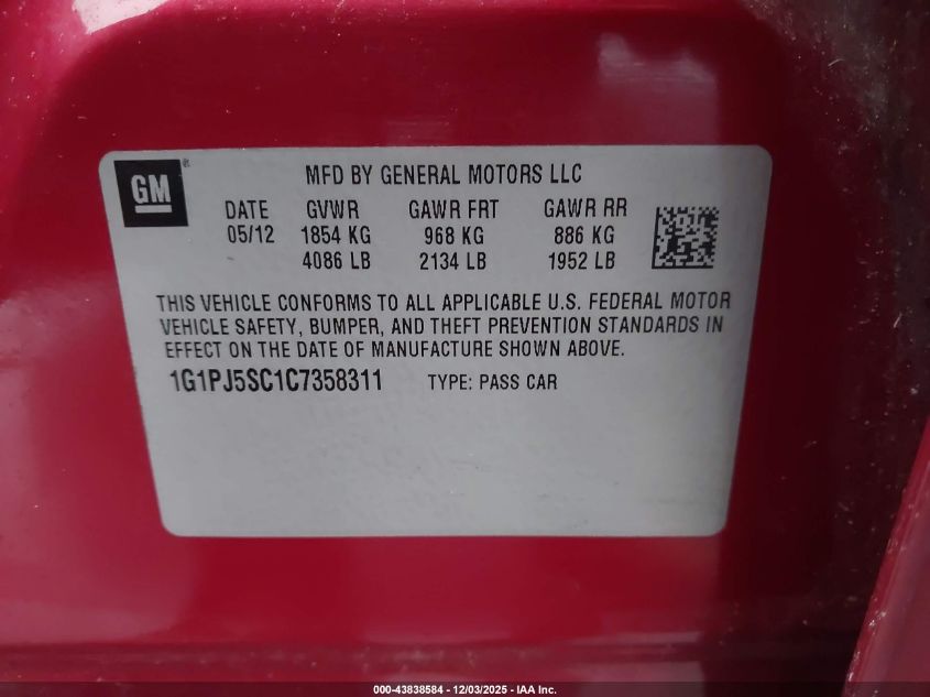 2012 CHEVROLET CRUZE 2012 року Бензин, 1.4, Передній привід, vin - 1G1PJ5SC1C7358311 з США