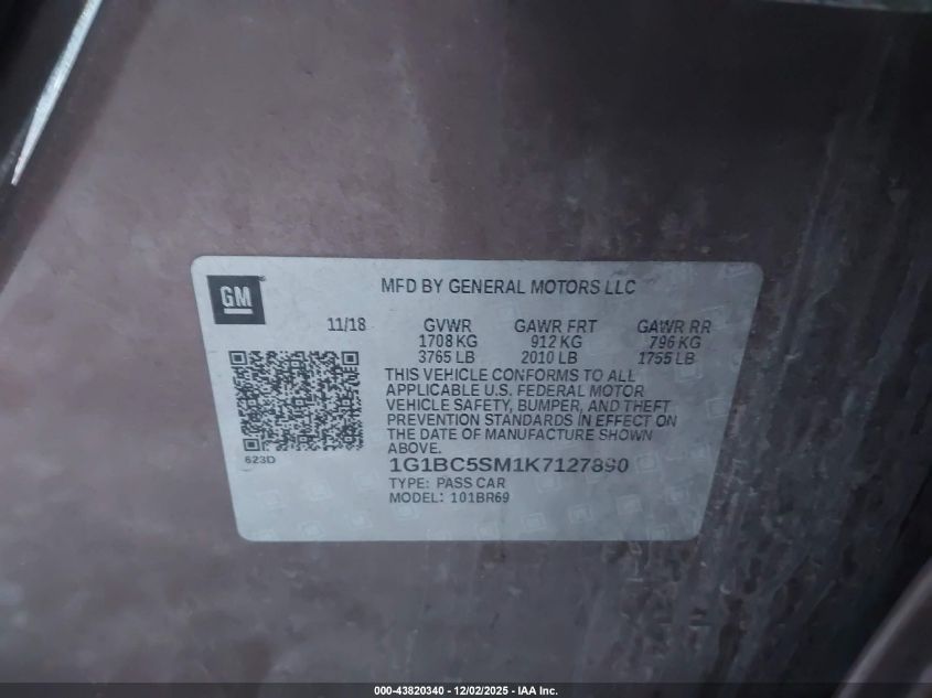 2019 CHEVROLET CRUZE 2019 року Бензин, 1.4, Передній привід, vin - 1G1BC5SM1K7127890 з США