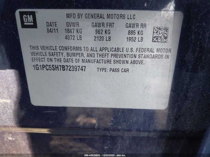 2011 CHEVROLET CRUZE 2011 року Бензин, 1.8, Передній привід, vin - 1G1PC5SH7B7239747 з США