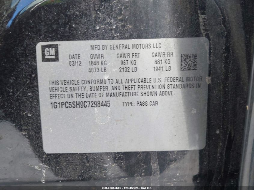 2012 CHEVROLET CRUZE 2012 року Бензин, 1.8, Передній привід, vin - 1G1PC5SH9C7298445 з США