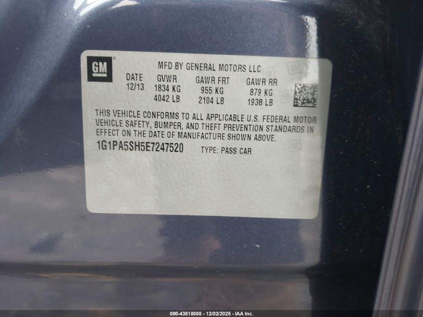 2014 CHEVROLET CRUZE 2014 року Бензин, 1.8, Передній привід, vin - 1G1PA5SH5E7247520 з США