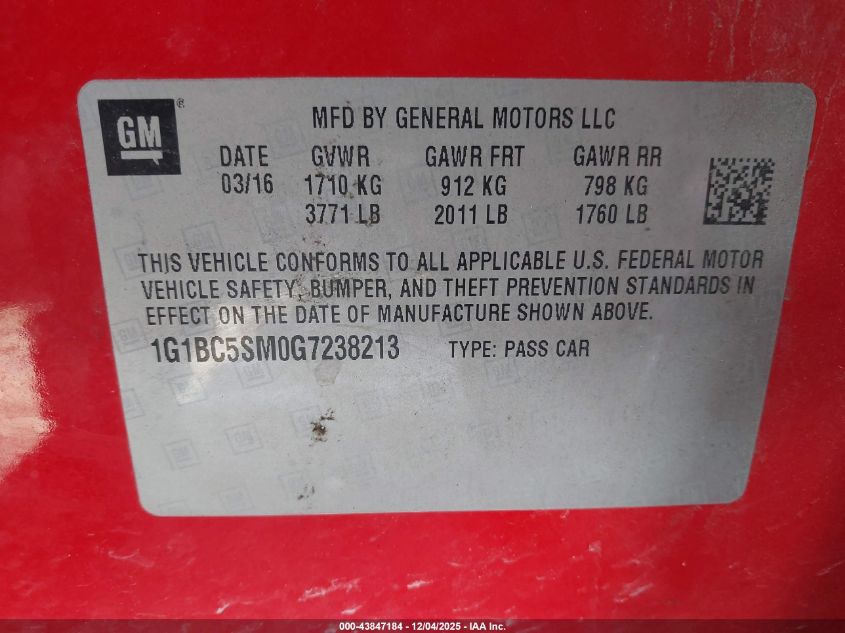 2016 CHEVROLET CRUZE 2016 року Бензин, 1.4, Передній привід, vin - 1G1BC5SM0G7238213 з США