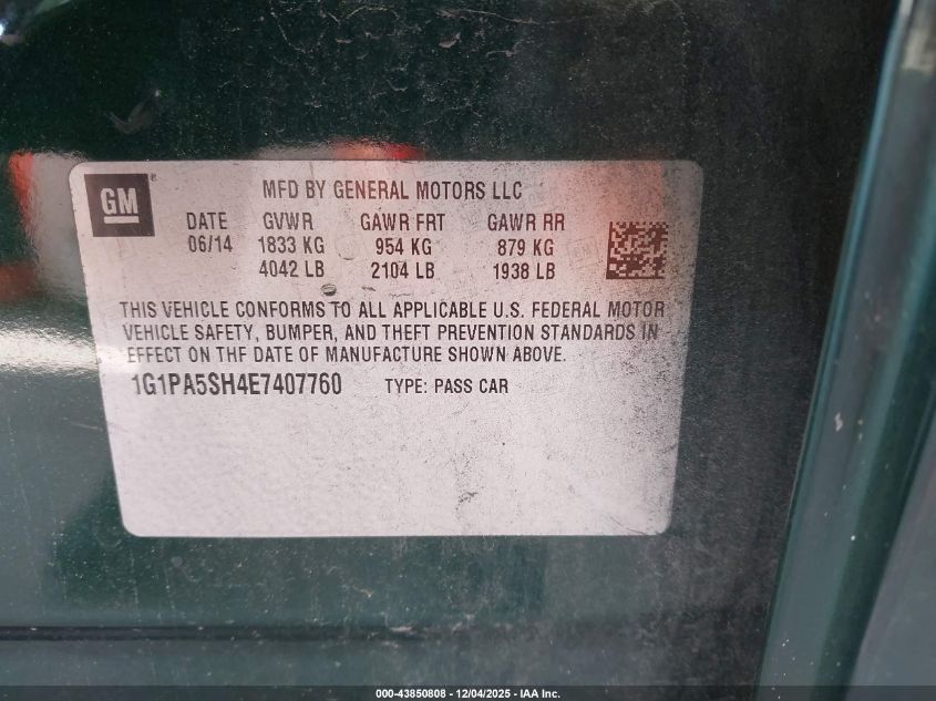 2014 CHEVROLET CRUZE 2014 року Бензин, 1.8, Передній привід, vin - 1G1PA5SH4E7407760 з США
