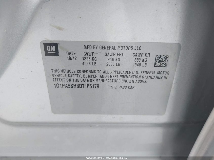 2013 CHEVROLET CRUZE 2013 року Бензин, 1.8, Передній привід, vin - 1G1PA5SH8D7165179 з США