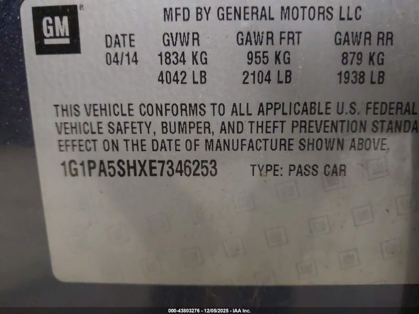 2014 CHEVROLET CRUZE 2014 року Бензин, 1.8, Передній привід, vin - 1G1PA5SHXE7346253 з США