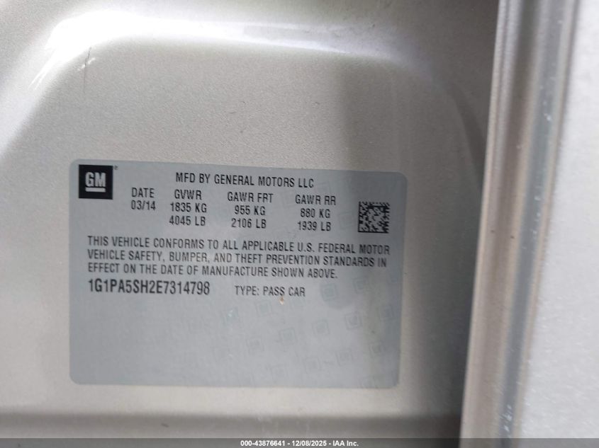 2014 CHEVROLET CRUZE 2014 року Бензин, 1.8, Передній привід, vin - 1G1PA5SH2E7314798 з США