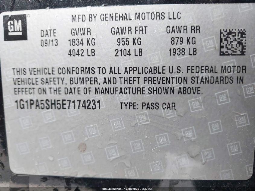 2014 CHEVROLET CRUZE 2014 року Бензин, 1.8, Передній привід, vin - 1G1PA5SH5E7174231 з США