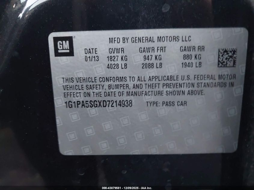 2013 CHEVROLET CRUZE 2013 року Бензин, 1.8, Передній привід, vin - 1G1PA5SGXD7214938 з США