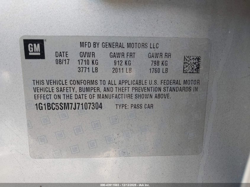 Колір СрібнийЦиліндри 4Привід Передній привідVIN 1G1BC5SM7J7107304Стан СтаціонарноУшкодження Передня або задня AutoRIA