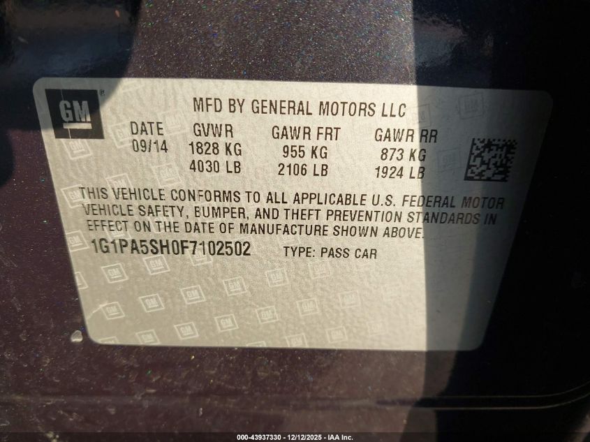 2015 CHEVROLET CRUZE 2015 року Бензин, 1.8, Передній привід, vin - 1G1PA5SH0F7102502 з США