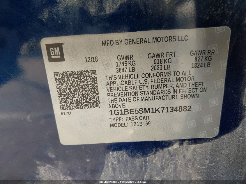 2019 CHEVROLET CRUZE 2019 року Бензин, 1.4, Передній привід, vin - 1G1BE5SM1K7134882 з США
