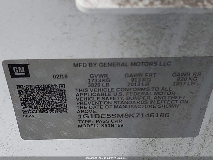 2019 CHEVROLET CRUZE 2019 року Бензин, 1.4, Передній привід, vin - 1G1BE5SM8K7146186 з США