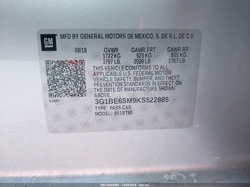 2019 CHEVROLET CRUZE 2019 року Бензин, 1.4, Передній привід, vin - 3G1BE6SM9KS522885 з США