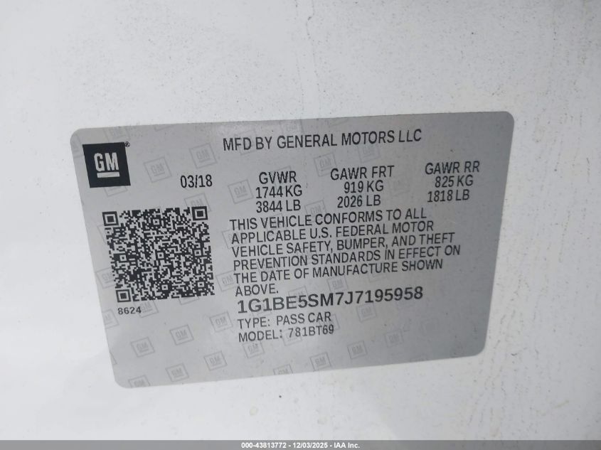 Колір БілийЦиліндри 4Привід Передній привідVIN 1G1BE5SM7J7195958Стан Заводиться та їде (перевірено)Ушкодження Передня або задня AutoRIA