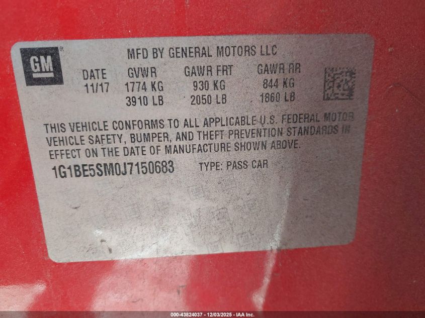 Колір ЧервонийЦиліндри 4Привід Передній привідVIN 1G1BE5SM0J7150683Стан Заводиться та їде (перевірено)Ушкодження Передня або задня AutoRIA