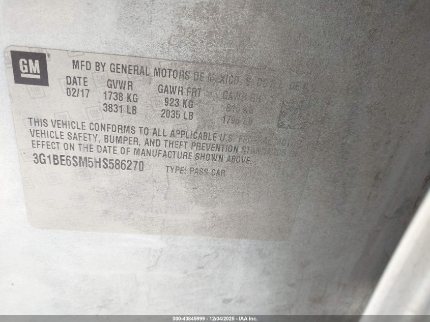 2017 CHEVROLET CRUZE 2017 року Бензин, 1.4, Передній привід, vin - 3G1BE6SM5HS586270 з США
