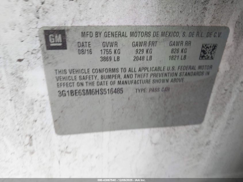 2017 CHEVROLET CRUZE 2017 року Бензин, 1.4, Передній привід, vin - 3G1BE6SM6HS516485 з США
