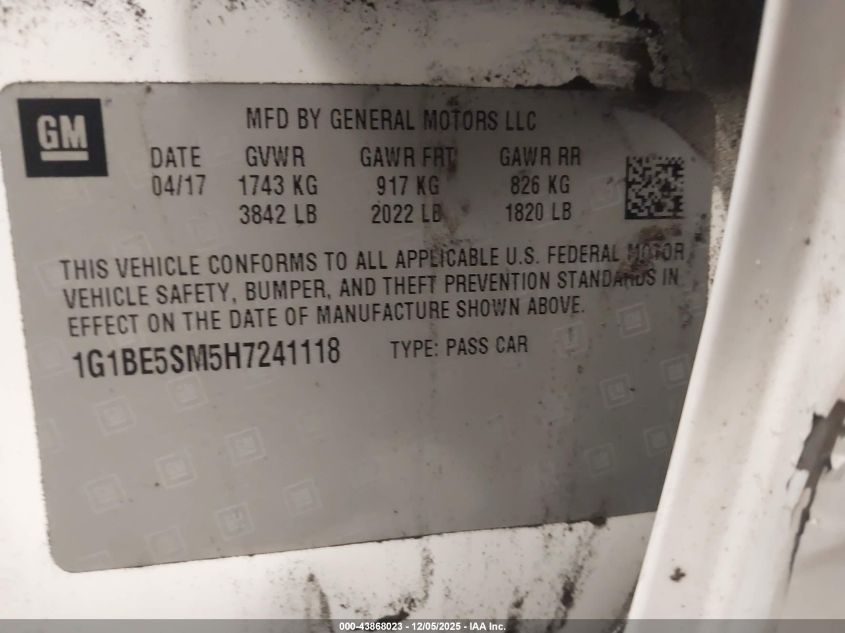 2017 CHEVROLET CRUZE 2017 року Бензин, 1.4, Передній привід, vin - 1G1BE5SM5H7241118 з США
