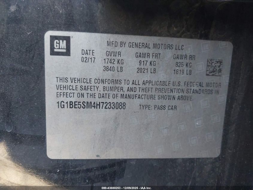 2017 CHEVROLET CRUZE 2017 року Бензин, 1.4, Передній привід, vin - 1G1BE5SM4H7233088 з США
