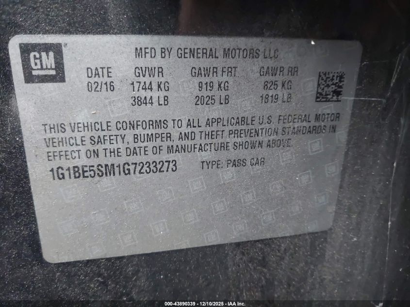 2016 CHEVROLET CRUZE 2016 року Бензин, 1.4, Передній привід, vin - 1G1BE5SM1G7233273 з США
