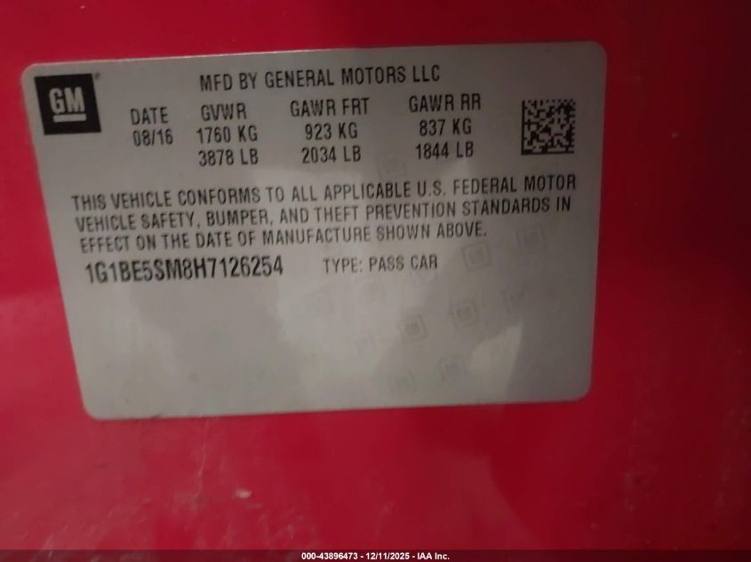 2017 CHEVROLET CRUZE 2017 року Бензин, 1.4, Передній привід, vin - 1G1BE5SM8H7126254 з США