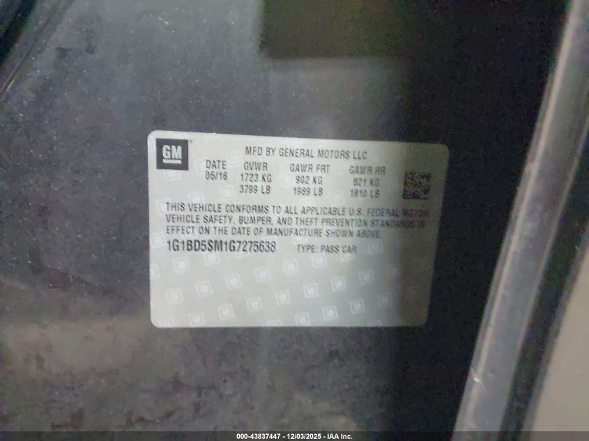 2016 CHEVROLET CRUZE 2016 року Бензин, 1.4, Передній привід, vin - 1G1BD5SM1G7275638 з США