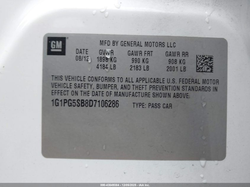 2013 CHEVROLET CRUZE 2013 року Бензин, 1.4, Передній привід, vin - 1G1PG5SB8D7106286 з США