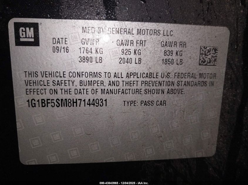 2017 CHEVROLET CRUZE 2017 року Бензин, 1.4, Передній привід, vin - 1G1BF5SM8H7144931 з США