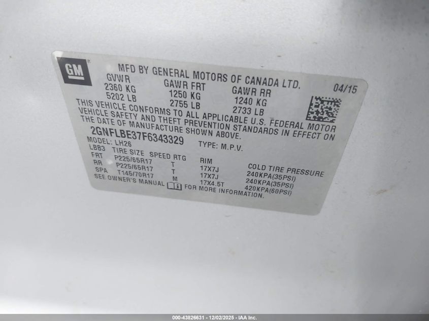 2015 CHEVROLET EQUINOX 2015 року Бензин, 3.6, Передній привід, vin - 2GNFLBE37F6343329 з США
