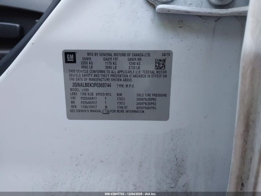 2015 CHEVROLET EQUINOX 2015 року Бензин, 2.4, Передній привід, vin - 2GNALBEK3F6360744 з США