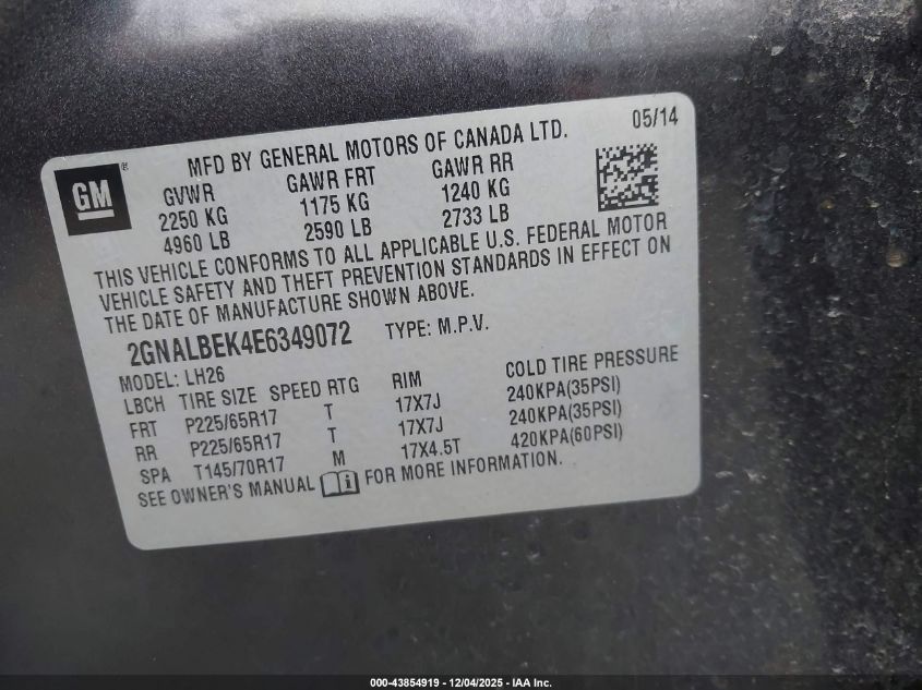 2014 CHEVROLET EQUINOX 2014 року Бензин, 2.4, Передній привід, vin - 2GNALBEK4E6349072 з США