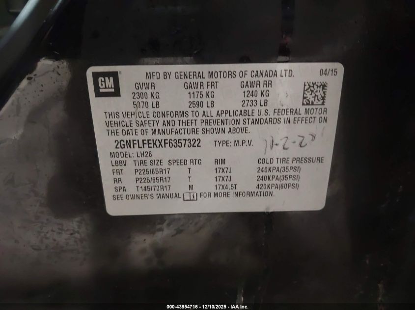 2015 CHEVROLET EQUINOX 2015 року Бензин, 2.4, Повний привід, vin - 2GNFLFEKXF6357322 з США