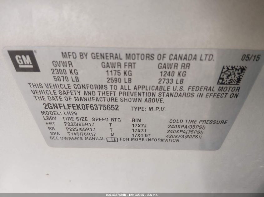 2015 CHEVROLET EQUINOX 2015 року Бензин, 2.4, Повний привід, vin - 2GNFLFEK0F6375652 з США