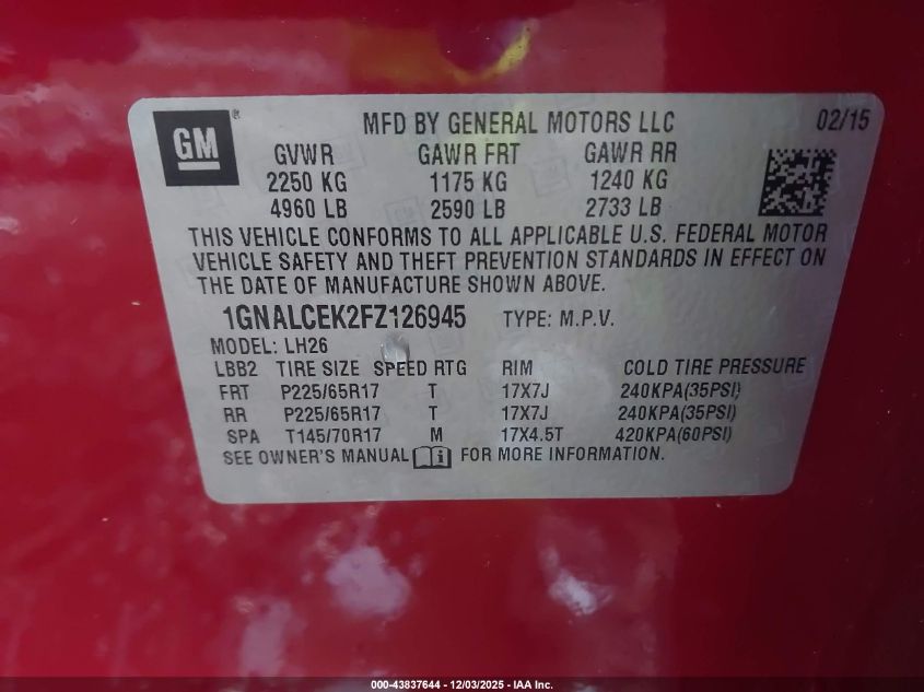 2015 CHEVROLET EQUINOX 2015 року Бензин, 2.4, Передній привід, vin - 1GNALCEK2FZ126945 з США